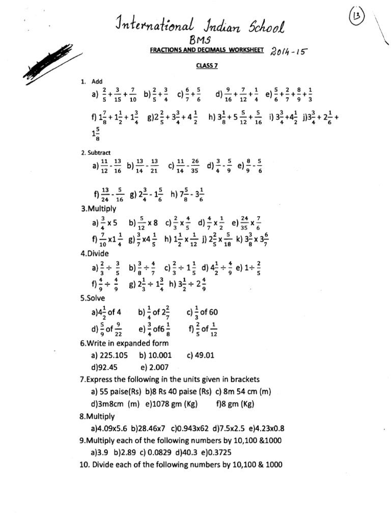 Worksheet for Class 7 Maths Chapter 2 Fraction and Decimals Example: 64 which means 6 out of 4 equal divisions. fraction and decimal. Multiplication of Fractions. Multiplying a fraction by a whole number: Example 1: 7 × ... Fractions and Decimals worksheet for Class 7 - Physicscatalyst This page contains Class 7 Fractions and Decimals worksheet. Practice it to improve your score in examination.